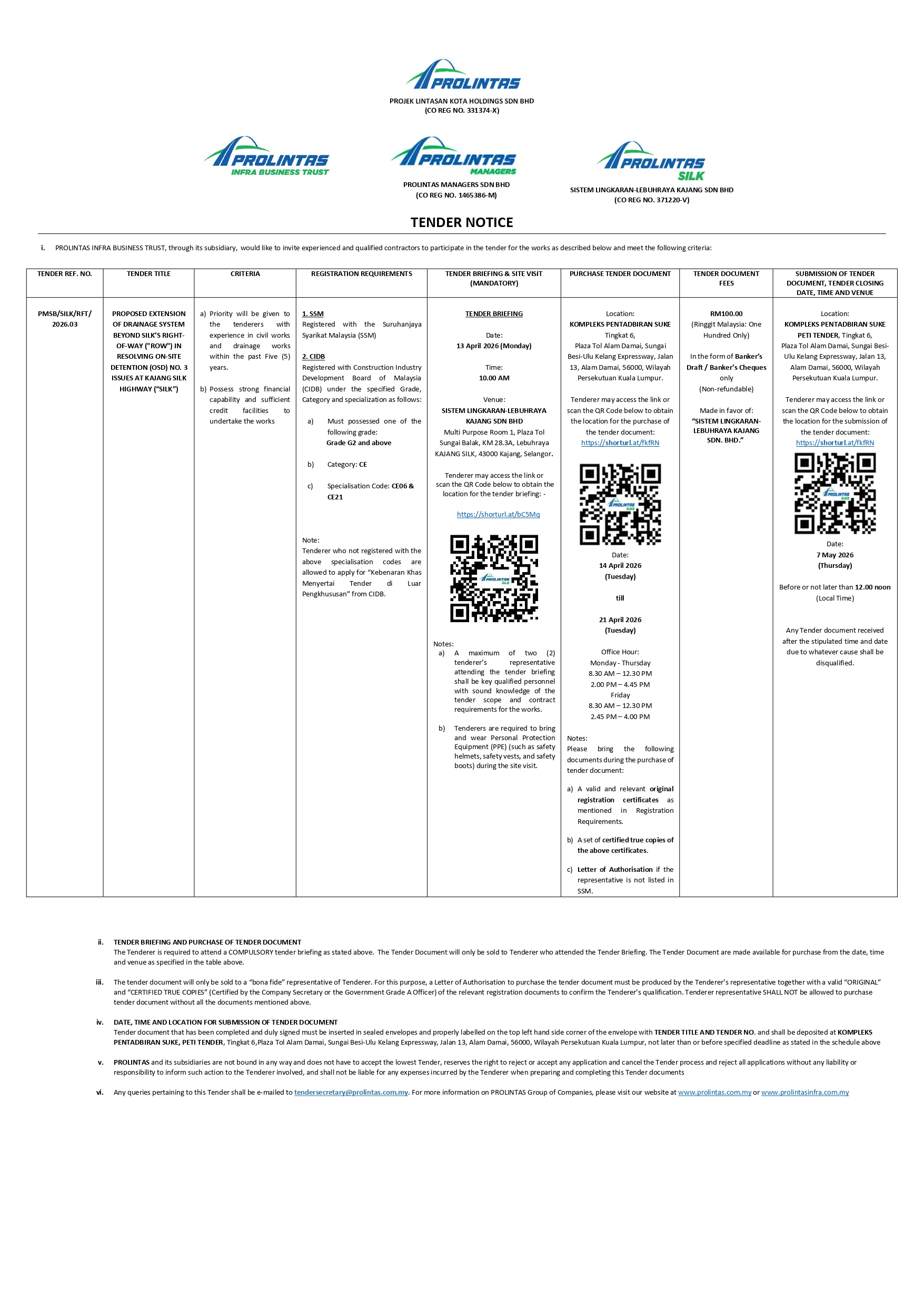 Tender Ad – PROPOSED EXTENSION OF DRAINAGE SYSTEM BEYOND SILK’S RIGHT-OF-WAY (“ROW”) IN RESOLVING ON-SITE DETENTION (OSD) NO. 3 ISSUES AT KAJANG SILK HIGHWAY (“SILK”)